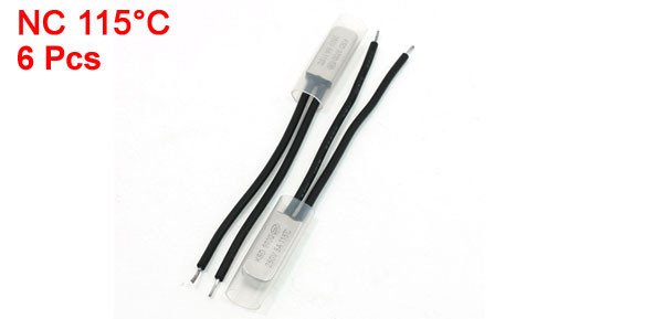 Rated Power 250V 5A Active Temperature 115°C Lead Wire Length 7.3cm / 2.9" Head Dimension 20 x 7.5 x 3.5mm/0.78" x 0.3" x 0.14"(L*W*T) Material Bimetal ,Plastic,Stainless Steel Main Color Silver Tone, Black Net Weight 22g Package Content 6 PCS x Temperature Control Switch - Reviews