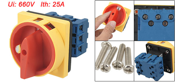 Product Name Universal Switch Model No. GLD11-25/04 Installing Holes Dia 3mm / 0.118" Ui 660V Ith 25A Ue 380V Ie 10A Installing Size 49 x 49mm / 1.9" x 1.9"(L*W) Overall Size 65 x 65 x 96mm / 2.6" x 2.6" x 3.8"(L*W*H) External Material Plastic Color Red, Black & Blue Net Weight 167g Package Content 1 x Universal Switch 4 x Installing Screw - Reviews