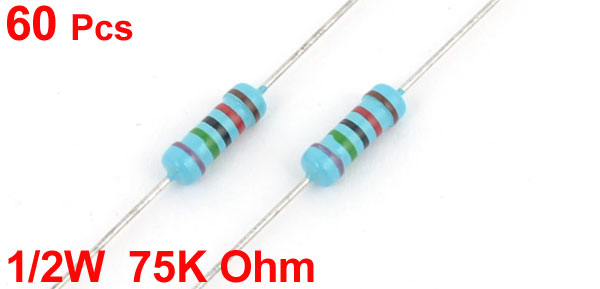 Product Name Metal Film Resistors Power Rating 1/2W Resistance 75K Ohm Tolerance ±1% Total Length(Approx.) 6cm /2.4" Body Size 3 x 8.5mm / 0.11" x 0.33" (D*L) Main Color Blue Weight 17g Package Content 60 Pcs( ±2%) x Metal Film Resistors - Reviews