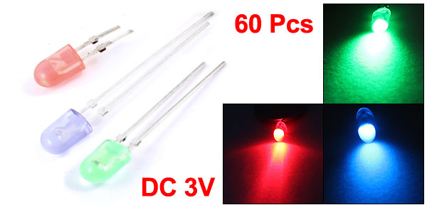 Product Name Light Emitting Diodes Emitting Light Color Red, Green, Blue Forward Voltage DC 3V Head Dia(Approx) 5mm/0.2" Terminal Center Distance(Approx) 2mm/0.08" Color Red, Green, Blue, Silver Tone Material Plastic, Metal Weight 14g Package Content 60 Pcs(±2%) x Light Emitting Diodes - Reviews