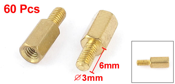Product Name Hex Standoff Spacer Thread Size M3 Male Female Male Thread Dia 3mm/0.12" Hex Spacer Width 5mm/0.2" Male Thread Length 6mm/0.24" Body Length 8mm/0.3" Material Brass Color Gold Tone Net Weight 72g Package Content 60Pcs(+/-2%) x Hex Standoff Spacer