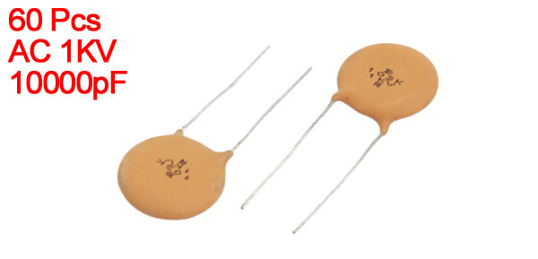 Product Name Ceramic Disc Capacitors Rated Voltage AC 1KV Capacitance 10000pF(10nF) Capacitance Tolerance ±10% Body Size 16 x 16 x 3mm/ 0.63" x 0.63" x 0.12" (L*W*T) Lead Space 10mm/ 0.4" Lead Length 25mm/ 1" Main Color Yellow, Silver Tone Weight 108g Package Content 60(±2%) Pcs x Ceramic Disc Capacitors - Reviews