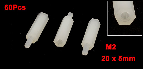 Product Name Hexagonal Threaded Spacer Thread Size M2 Thread Length 5mm / 0.2" Tube Length 15mm / 0.59" Total Size 20 x 5mm / 0.8" x 0.2" (H*D) Material Nylon Color White Net Weight 15g Package Content 60 Pcs (±2%) x Hexagonal Threaded Spacer - Reviews
