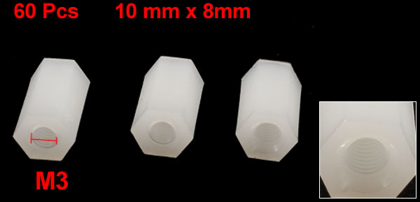 Product Name Hexagonal Threaded Spacer Thread Size M3 Total Size 10 x 8mm / 0.4" x 0.3" (H*D) Material Nylon Color White Net Weight 15g Package Content 60 Pcs (±2%) x Hexagonal Threaded Spacer - Reviews
