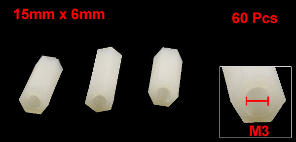 Product Name Hexagonal Threaded Spacer Thread Size M3 Total Size 15 x 6mm / 0.59" x 0.24" (H*D) Material Nylon Color White Net Weight 20g Package Content 60 Pcs x Hexagonal Threaded Spacer - Reviews