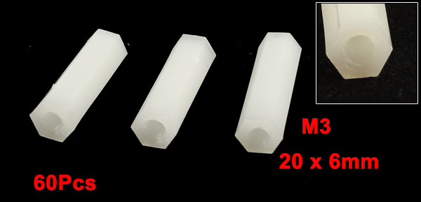 Product Name Threaded Spacer Thread Size M3 Total Size 20 x 6mm / 0.8" x 0.24" (H*D) Material Nylon Color White Net Weight 28g Package Content 60 Pcs x Hexagonal Threaded Spacer - Reviews