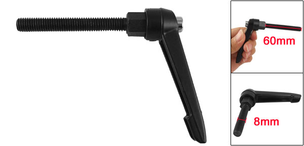 Product Name Adjustable Handle Material Metal Color Black Thread Diameter 8mm/ 0.314" Thread Length 60mm/ 2.36" Lever Length 60mm/ 2.36" Overall Size 73 x 90mm/ 2.87" x 3.54"(L*W) Net Weight 67g Package Content 1 x Machinery Adjustable Handle - Reviews