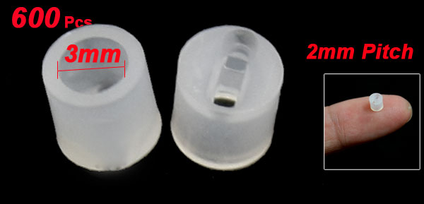 Product Name LED Spacers Quantity 600±2% Inner Hole Dia.(Approx.) 3mm Hole Pitch(Approx.) 2mm Total Size(Approx.) 4 x 4mm/ 0.16" x 0.16" (D*L) Material Nylon Color White Net Weight 25g Package Content 600 x LED Spacers - Reviews