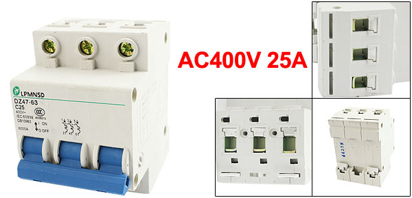 Product Name Miniature Circuit Breaker Model Number DZ47-63 C25 Rated Circuit Breaking Capacity 6000A Rated Voltage AC 400V Rated Current 25A Poles 3 Poles Rail Mounting 35mm DIN Rail Overall Size (Approx) 79 x 76 x 53mm/3.1" x 3" x 2.1" (L*W*T ) Material Plastic, Electric Components Main Color White Net Weight 232g Package Content 1 x Miniature Circuit Breaker - Reviews