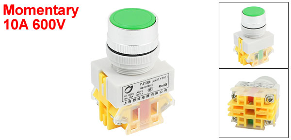 Product Name Push Button Switch Mode Y090-11BN Contact Type 1NO 1NC (DPST) Action Type Momentary Ith 10A Ui 600V Terminal Quantity 4 Panel Cutout Diameter 24mm / 0.94" Fit Panel Max. Thickness 6mm / 0.24" Button Diameter 24mm/ 0.94" Total Size(Approx) 37 x 30 x 62mm / 1.5" x 1.2" x 2.4" (L*W*H) External Material Plastic, Metal Button Color Green Net Weight 37g Package Content 1 x Push Button Switch - Reviews
