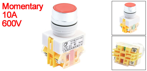 Product Name Push Button Switch Model No. YJ139 Contact Type 1 NO + 1 NC Action Type Momentary Ith 10A Ui 600V Terminal Number 4 Panel Cutout Diameter 2.3cm / 0.9" Fit Panel Thickness 6mm / 0.24" Button Diameter 2.4cm / 0.94" Total Size 3.7 x 3 x 6.2cm / 1.5" x 1.2" x 2.4" (L*W*H) Main Material Plastic, Metal Cap Color Red Weight 40g Package Content 1 x Push Button Switch - Reviews