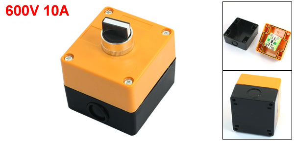 Details600V 10A DPST 3 Position Rotary Switch w Plastic Control Box Orange Black  Product Name Rotary Switch w Box Position Number 3 Position Contact Type DPST Ui 600V Ith 10A Terminal Quantity 4 Panel Cutout Diameter 22mm/ 0.87" Button Diameter 24mm/ 0.94" Switch Size 38 x 30 x 73mm/ 1.5" x 1.2" x 2.9" (L*W*T) Box Size 77 x 71 x 64mm/ 3" x 2.8" x 2.5"(L*W*T) Mounting Hole Dia. 5.8mm/ 0.23" Total Height 90mm/ 3.5" Box External Color Orange, Black External Material Plastic Weight 150g Package Content 1 x Rotary Switch w Box 4 x Screws