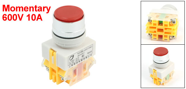 Details600V 10A NO/NC 4 Terminals 24mm Dia Red Momentary Pushbutton Switch  Product Name Push Button Switch Action Type Momentary Contact Type 1NO 1NC (DPST) Ui 600V Ith 10A Terminals Quanlity 4 Button Diameter 24mm/ 0.94" Panel Cutout Diameter 24mm/ 0.94" Fit Panel Max. Thickness 6mm/ 0.24" Size 37 x 30 x 63mm/ 1.5" x 1.2" x 2.5" (L*W*H) Button Color Red Material Plastic, Metal Weight 37g Package Content 1 x Push Button Switch