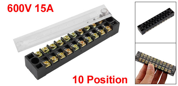 Product Name Barrier Terminal Block Model TB1510 Material Metal, Plastic Rated Voltage/Current 600V 15A Position 10 Position Size 10.8 x 2.2 x 1.8cm / 4.3" x 0.9" x 0.7"(L*W*H) Color Clear, Bronze tone, Black Weight 44g Package Content 1 x Barrier Terminal Block - Reviews