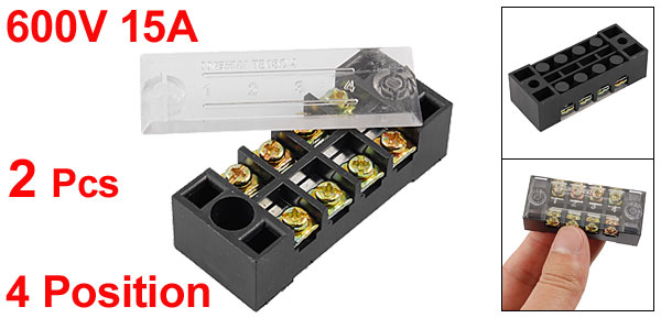 Product Name Barrier Terminal Block Model TB1504 Material Metal, Plastic Rated Voltage/Current 600V 15A Position 4 Position Size 5.4 x 2.2 x 1.7cm / 2.1" x 0.9" x 0.7"(L*W*H) Color Clear, Bronze tone Weight 39g Package Content 2 x Barrier Terminal Block - Reviews