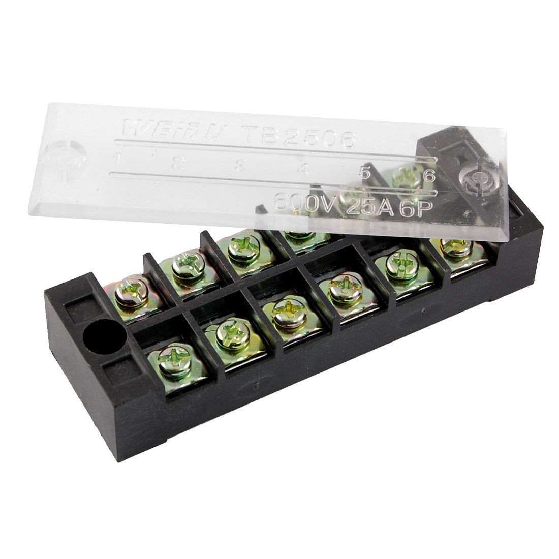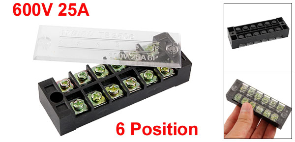 Product Name Barrier Terminal Block Model TB2506 Material Metal, Plastic Rated Voltage/Current 600V 25A Position 6 Position Size 9.1 x 3 x 1.9cm / 3.6" x 1.2" x 0.8"(L*W*H) Color Clear, Bronze tone, Black Weight 57g Package Content 1 x Barrier Terminal Block - Reviews