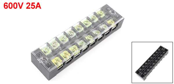 Product Name Barrier Terminal Block Model No. TB-2508L Material Metal, Plastic Rated Value 600V 25A Poles 8P (Dual Row) Size 115 x 30 x 19mm/ 4.5" x 1.2" x 0.75" (L*W*T) Fixing Hole Diameter 4.5mm/0.18" Fixing Hole Center Distance 10.5cm/ 4" Main Color Black Total Weight 67g Package Content 1 x Barrier Terminal Block w Cover - Reviews