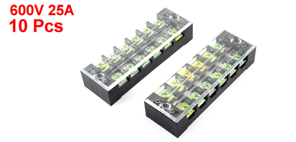 Product Name Barrier Terminal Block Material Metal, Plastic Rated Value 600V 25A Poles 6P (Dual Row) Size 9 x 3 x 1.7cm/ 3.5" x 1.2" x 0.6" (L*W*T) Color Black, Clear Net Weight 497g Package Content 10 x Barrier Terminal Block - Reviews