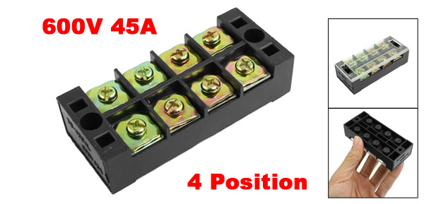 Product Name Terminal Blocks Type TB-4504L Voltage 600V Current 45A Position Double Row 4 Positons Material Plastic, Electronic Parts Main Color Black Size 8.5 x 3.5 x 2cm/ 3.4" x 1.4" x 0.8"(L*W*H) Weight 77g Package Content 1 x Terminal Blocks
