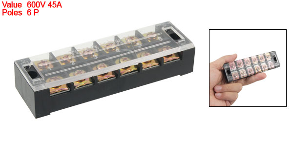 Product Name Barrier Terminal Block Material Metal & Plastic Rated Value 600V 45A Poles 6 P (Dual Row) Size 11.9 x 3.8 x 2.4cm / 4.7" x 1.5" x 0.9" (L*W*H) Color Black & Copper Tone Weight 113g Package Content 1 x 6P Barrier Terminal Block - Reviews