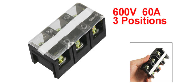 Product Name Barrier Terminal Block Material Metal, Plastic Color Black, Clear, Gold Tone Rated Value 600V 60A Type 3 Positions, 2 Rows Size 8.5 x 4.2 x 3.5cm / 3.3'' x 1.7'' x 1.4'' (L*W*H) Weight 121g Package Content 1 x Barrier Terminal Block - Reviews