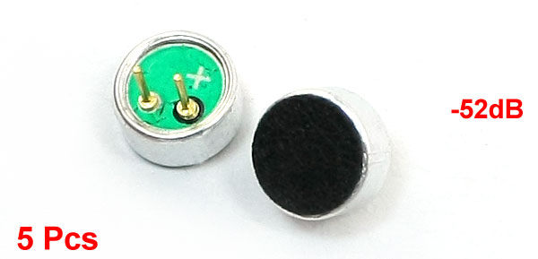 Product Name Omni-Directional Electret Condenser Microphone Sound Channel Number Stereo Output Impedence 2kOhm Frequency Response 20kHz Microphone Unit 6027 Sensitivity -52dB Body Size 6 x 3mm / 0.24" x 0.12" (D*T) Pin Pitch 2mm / 0.08" External Material Alumnium Main Color Silver Tone, Black, Green Weight 1g Package Content 5 x Omni-Directional Electret Condenser Microphone