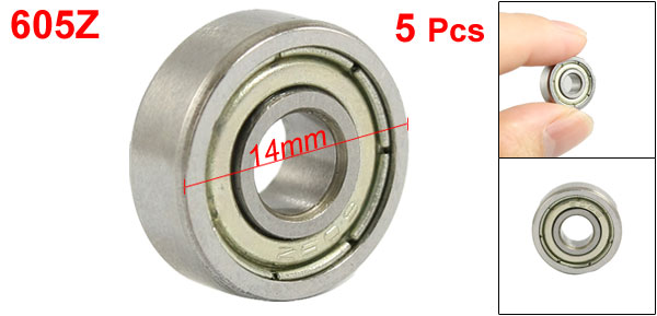 Product Name Deep Groove Ball Bearing Bearing Model 605Z Bearing Standard(mm) 5 x 14 x 5 Inner Diameter 5mm/ 0.19" Outer Diameter 14mm/ 0.55" Width 5mm/ 0.19" Material Metal Main Color Silver Tone Weight 19g Package Content 5 x Deep Groove Ball Bearings - Reviews