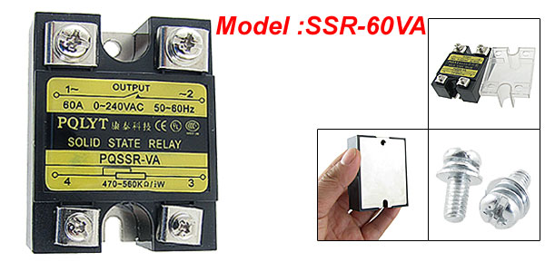 Product Name Solid State Relay Voltage Resistance Regulator Model SSR-60VA Output 0-240V AC, 50-60Hz, 60A Input Control Methods 470-560KΩ / 1/4W Potentiometer(Potentiometer is Not Included) Size (Approx.) 4.55 x 6 x 3.16cm / 1.8" x 2.3" x 1.2" (L*W*T) Hole in Base Dia 0.44cm / 0.173" Color As Picture Shown Material Metal, Plastic, Electric Parts Weight 118g Package Content 1 x Solid State Relay Voltage Resistance Regulator 2 x Fixed Screw - Reviews