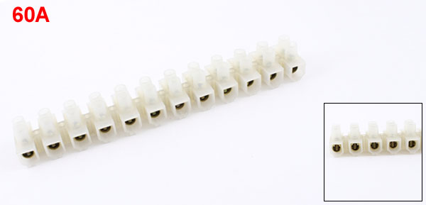 Product Name Terminal Block Material(external) Plastic Color White, Gold Tone Type 12 Postions, 2 Rows Rated Value 60A Cable Entry Diameter 6mm/ 0.24" Size 178 x 26 x 23mm/ 7" x 1" x 0.9" (L*W*H)