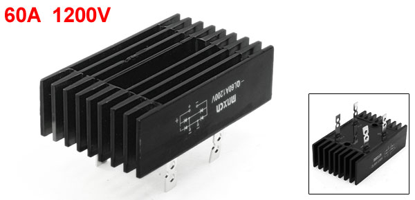 Product Name Bridge Rectifier Model -QL60A/1200V Output Current(DC) 60A Repetitive Peak Reverse Voltage(AC) 1200V Fixing Holes Diameter 5mm / 0.19" Fixing Holes Spacing 52mm / 2" Main Body Size 98 x 59 x 29mm / 3.86" x 2.3" x 1.1" (L*W*T) Overall Height 56mm / 2.2" Material Metal Color Black Net Weight 240g Package Content 1 x Bridge Rectifier - Reviews