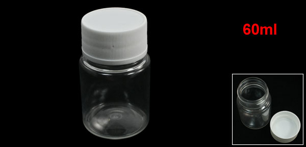 Product Name Lab Bottle Capacity 60ML Material Plastic Color Clear,White Mouth Diameter 3cm/ 1.2" Size 7 x 4.2cm/ 2.76" x 1.65" (H*D) Net Weight 16g Package Content