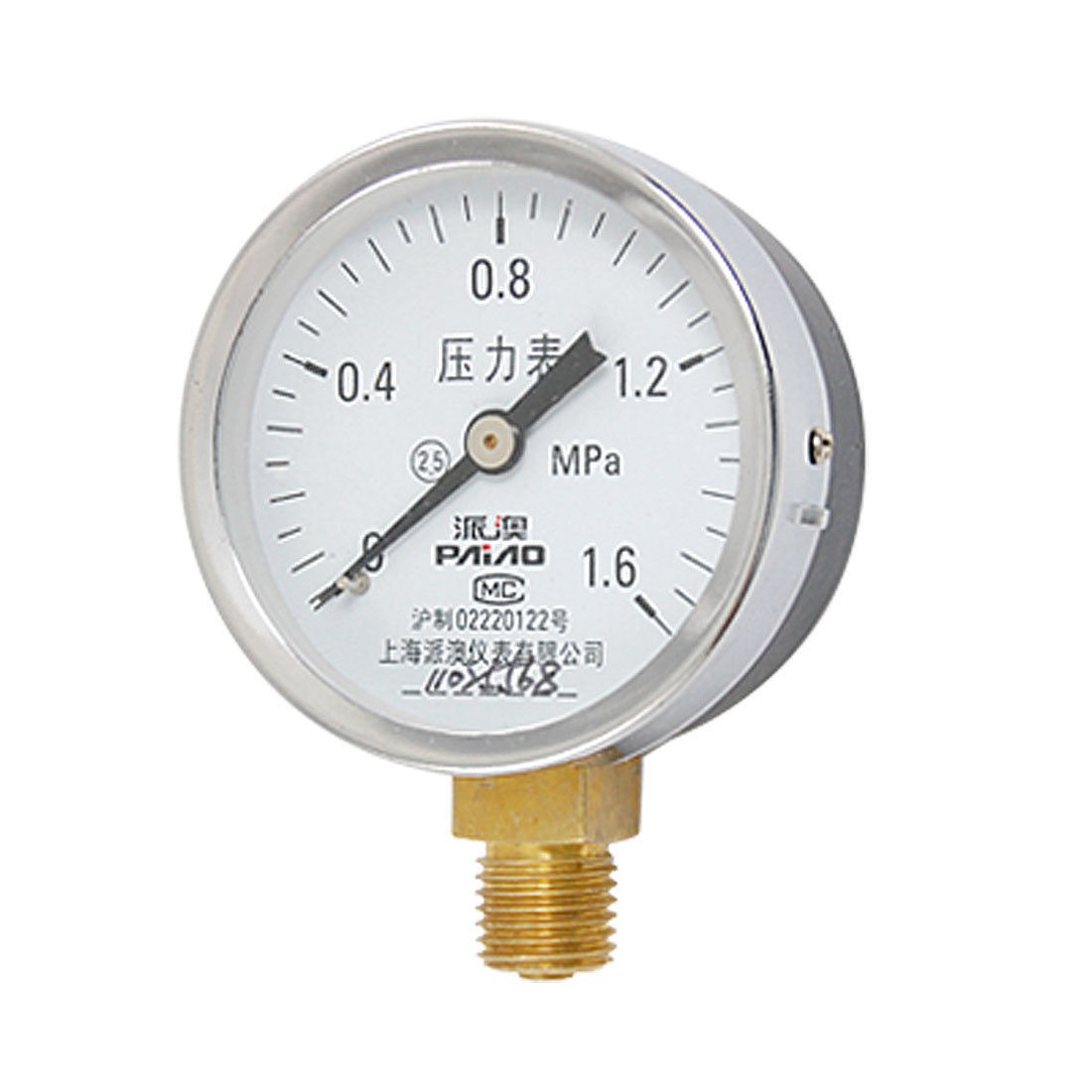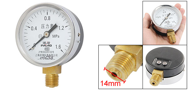 Product Name Pressure Gauge Pressure Intensity 0 ~ 1.6 Mpa Accuracy Class Class 2.5 Thread Diameter 14mm/ 0.55" Case Size 6 x 2.9cm/ 2.36" x 1.14" (D*T) Main Color Black, Silver Tone, Gold Tone Material Metal Net Weight 119g Package 1 x Air Pressure Gauge - Reviews