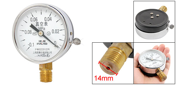 Product Name Pressure Gauge Pressure Intensity -0.1 ~ 0 Mpa Accuracy Class Class 2.5 Thread Diameter 14mm/ 0.55" Case Size 6 x 2.9cm/ 2.36" x 1.14" (D*T) Main Color Black, Silver Tone, Gold Tone Material Metal Net Weight 95g Package 1 x Air Pressure Gauge - Reviews
