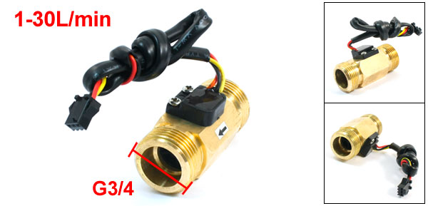 Product Name Water Flow Sensor Switch Model SEN-HZ43WB Type Hall Effect Max Switch Current & Voltage 10mA, DC3-18V Working Range 1-30L/min Male Port Thread Dia(Each End) G3/4 Max. Pressure 1.75Mpa Insulation Resistance 100M Ohm(Min.) Total Size 60 x 32mm/ 2.4" x 1.3"(L*Max.W) Cable Length 34cm/ 13.4" Main Material Copper Color Gold Tone, Black Weight 153g Package Content 1 x Water Flow Sensor Switch - Reviews
