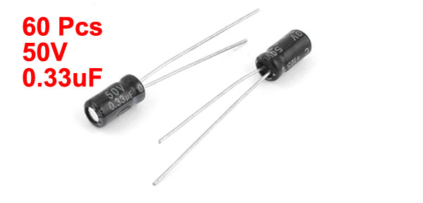 Product Name Electrolytic Capacitor Type Radial Maximum Temperature 105°C Voltage 50V Capacitance 0.33uF Size 4 x 7mm/0.16" x 0.27"(D*H) Lead Spacing 2mm/0.08" Lead Length 24mm/0.95" 20mm/0.78" External Material Aluminum Total Net Weight 13g Main Color Black Package Content 60PCS x Electrolytic Capacitors - Reviews