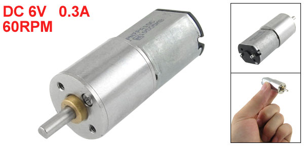 Product Name DC Geared Motor Rated Voltage DC 6V Rated Current 0.3A ( no load ) Speed 60 RPM Shaft Diameter 3mm/ 0.118" Gearbox Size 16 x 17mm/ 0.63" x 0.66" (D*H) Overall Size 16 x 47mm/ 0.63" x 1.8" (D*H) Main Color Silver Tone Material Metal Weight 24g Package 1 x DC Geared Motor - Reviews