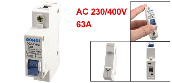 Product Name Circuit Breaker Model No. DZ47-63 C63 Material Plastic, Electric Components Main Color White, Blue Rated Voltage AC 230/400V Rated Current 63A Breaking Capacity 4500A Total Size (Approx.) 7.7 x 1.8 x 7.2cm / 3" x 0.72" x 2.8"(L*W*H) Number of Poles 1 Mount Type DIN Rail Weight 96g Package Content 1 x Circuit Breaker - Reviews