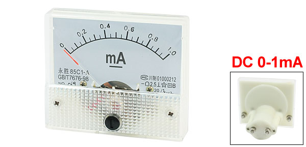 Product Name Analog Ammeter Model No. 85C1-A Measuring Current Range DC 0-1mA Accuracy Class 2.5 Meter Front Size(Approx.) 64 x 56 x 10mm / 2.5" x 2.2" x 0.4"(L*W*T) Thread Dia 3mm/ 0.12" Overall Depth 56mm / 2.2" Material Plastic, Electronic Components Color White, Off White Weight 74g Package Content 1 x Analog Ammeter