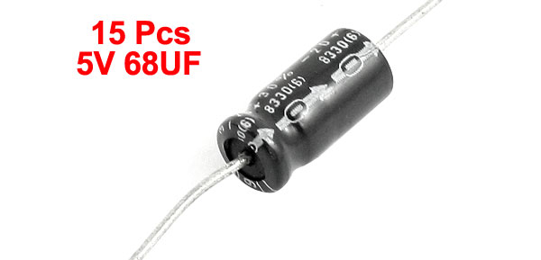 Product Name Electrolytic Capacitor Type Axial Lead Features Standard General Purpose Withstand Voltage 5V Capacitance 68UF Body Size 6.5 x 13mm / 0.25" x 0.51" (D*L) Lead Length 35mm/ 1.4", 33mm/ 1.2" Dielectric Material Aluminum Weight 16g Color Black Package Content 15 Pcs x Electrolytic Capacitors - Reviews