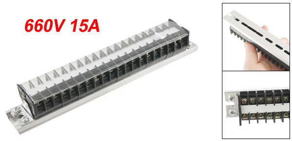 Product Name Barrier Terminal Block Material Metal, Plastic, Aluminum Rated Value 660V 15A Poles 20P (Dual Row) Size 195 x 27 x 29mm/ 7.7" x 1" x 1.1" (L*W*T) Color Black, Clear, Silver Tone Net Weight 117g Package Content 1 x Barrier Terminal Block - Reviews