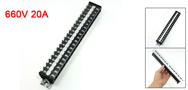 Product Name Terminal Block Model TD-2020 Type 2 Rows, 20 Positions Material Metal, Plastic Color Black, Silver Tone, Clear Rated Voltage 660V 20A Rail Mount Width 25mm/ 1" Total Size 26.5 x 4 x 4cm /10.4'' x 1.5'' x 1.5"(L*W*H) Weight 278g Package Content 1 x Barrier Terminal Block - Reviews