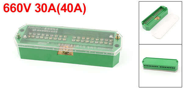 Product Name Power Distribution Block Model FJ6/JHD-4/c Current Current 30A (for each meter) Rated Valued 660V 50/60Hz Design 1 Inlet to 18 Outlet Fit for 18 Electricity Meters Material Plastic, Electronic Parts Color Green, Clear Size 18.5 x 6 x 3.6cm/ 7.3" x 2.4" x 1.4" (L*W*T) Net Weight 377g Package Content 1 x Power Distribution Block