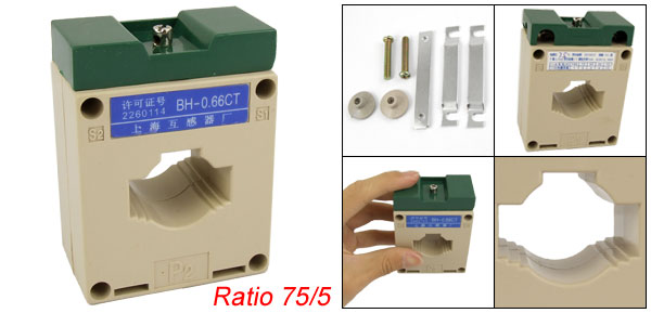 Product Name Current Transformer Model Number BH-0.66CT Rated Current Ratio 75/5 Accuracy Class 0.5 Conductor Through 1T Rated Load 5VA Prescribed Minimum 3.75VA Frequency 50/60Hz Maximum Rated Voltage 0.66KV Primary Current(A) 150 75 50 30 15 Primary Coil Number of Turns 1 2 3 5 10 Perforation Size 23mm(Diameter), 30.5 x 11mm Overall Size 80 x 60 x 37mm/3.1" x 2.4" x 1.5"(L*W*T) Material Plastic, Electronic Parts Color As Picture Shown Weight 240g Package Content 1 x Current Transformer