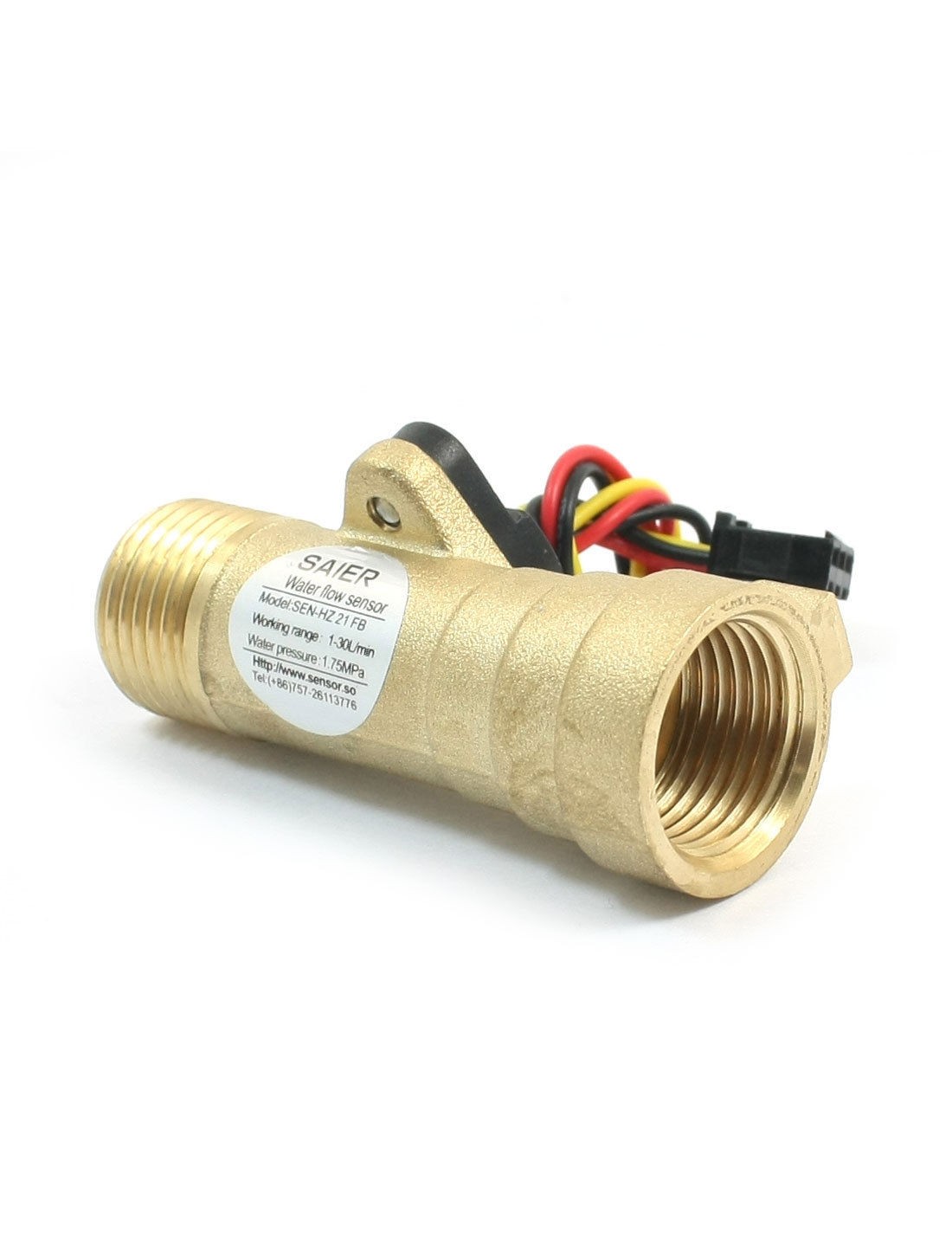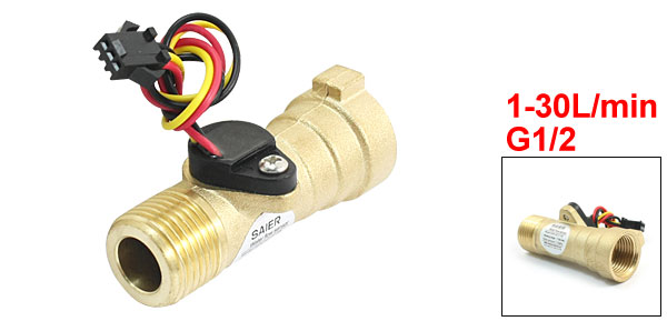 Product Name Water Flow Sensor Model SEN-HZ21FB Type Hall Effect Max Switch Current & Voltage 10mA, DC3-18V Working Range 1-30L/min Male Female Port Thread Dia G1/2 Max. Water Pressure 1.75Mpa Insulation Resistance 100M Ohm(Min.) Total Size 68 x 29mm/ 2.7" x 1.1"(L*Max.W) Cable Length 14cm/ 5.5" Main Material Copper Color Gold Tone, Black Weight 90g Package Content 1 x Water Flow Sensor - Reviews
