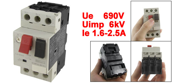 Product Name Motor Circuit Breaker Thermal Protection Adjustable Range 1.6-2.5A Uimp 6kV Breaking Capacity Ue Icu Ics%Icu 230/240 100kA 100 400/415V 100kA 100 500V 100kA 100 690V 3kA 75 Rating Vac 1 phase 3 Phase 200 1/6HP 1/2HP 230 1/6HP 1/2HP 460 -- 1HP 575 -- 1.5HP Overall Size (Approx.) 89 x 45 x 78mm / 3.5" x 1.8" x 3.1"(L*W*H ) Material Plastic, Electric Components Weight 252g Package Content 1 x Motor Circuit Breaker - Reviews