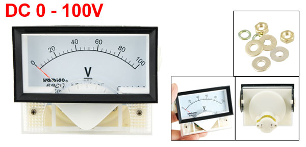 Details69C17 DC 0-100V Rectangle Analog Volt Panel Meter Gauge  Product Name Analog Voltmeter Model 69C17 Measuring Voltage Range DC 0 - 100V Accuracy Class 2.5 Meter Face Size(Approx) 8.5 x 6.5 x 2cm / 3.3" x 2.5" x 0.78"(L*W*T) Thread Size 0.4 x 0.83cm / 0.15" x 0.33"(D*L) Overall Depth 6cm / 2.4" Color White Net Weight 80g Package Content 1 x Analog Voltmeter