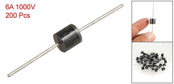 Details6A 1000V High Voltage Axial Lead Rectifier Diodes 6A10  Product Name Rectifier Diodes Model 6A10 Peak Repetitive.Reverse Voltage 1000V Max. Forward Current 6A Material Type Silicon Body Size(Approx.) 9.05 x 9mm / 0.356" x 0.354"(L * D) Lead Size (Each End) 27 x 1.27mm / 1.0" x 0.05" (L * D) Total Length (Approx.) 60mm / 2.36" Color As Picture Shown Weight 384g Package Content 200(±2%) x Rectifier Diodes