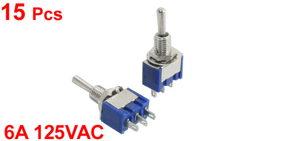 Product Name Toggle Switch Type SPDT Latching ON-OFF-ON Position 3 Voltage & Current 6A 125VAC Total Size 13 x 11 x 33mm/0.51" x 0.43" x 1.3"(L*W*H) Mounting Thread 5.8mm/0.23" Material Metal, Plastic Main Color Blue, Silver Tone Weight 62g Package Content 15Pcs x Toggle Switches - Reviews