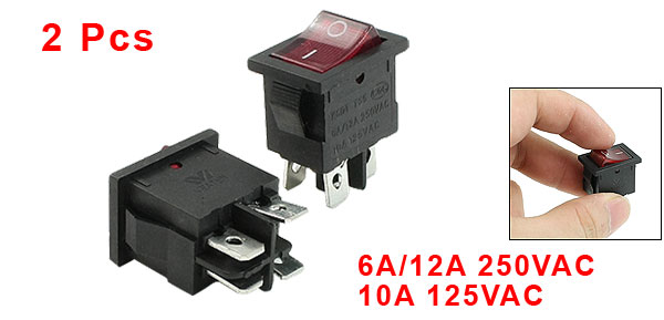 6A/12A 250VAC 10A 125VAC 4 Pin DPST Red Indicator Light Rocker Switch 2 Pcs