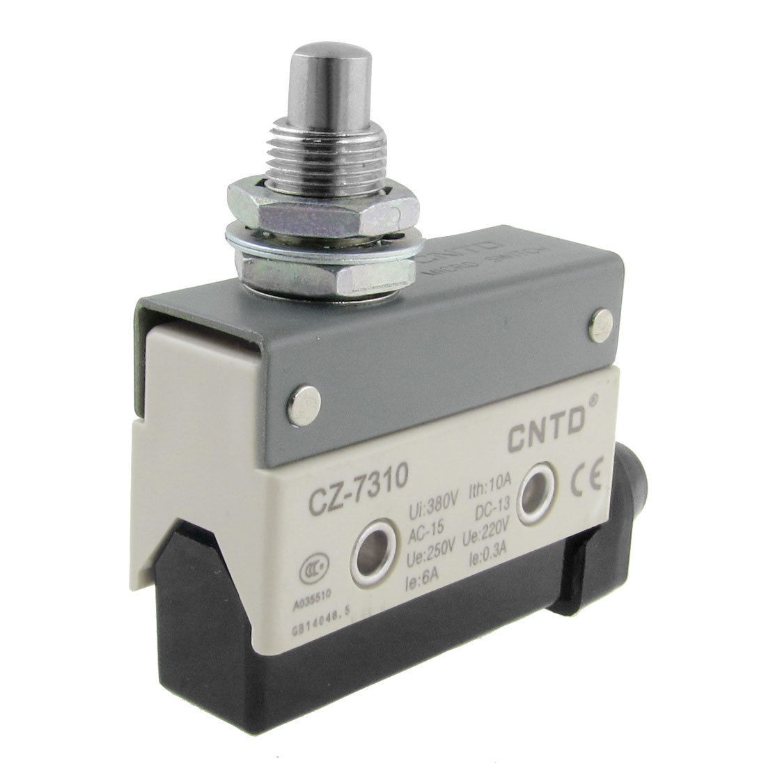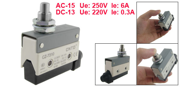 Product Name Micro Switch Model No. CZ-7310 Actuator Type Panel Mount Plunger Contact Type 1 NO, 1 NC, 1 Com Terminal Type Screw Terminals Ui 380V Ith 10A AC-15 Ue: 250V, le: 6A DC-13 Ue: 220V, le: 0.3A Plunger Diameter 8mm / 0.31" Mounting Hole Diameter 12mm / 0.47" Overall Size 70 x 22 x 66mm / 2.8" x 0.9" x 2.6"(L*W*H) Material Metal, Plastic & Rubber Net Weight 83g Package Content 1 x Micro Switch - Reviews
